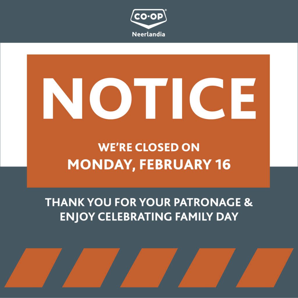 Family Day reminder from Neerlandia Co-op. We’re taking the day to celebrate with our loved ones and will be CLOSED Monday, February 16.