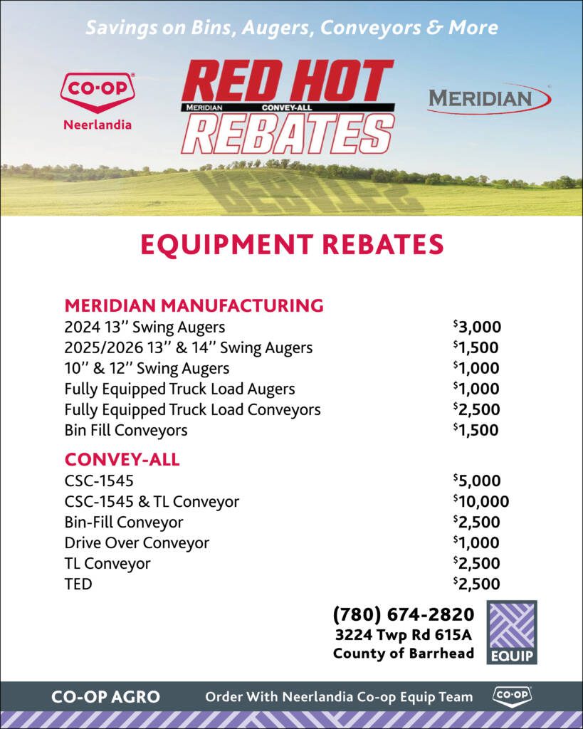 Meridian rebates help your farm invest in reliable, high-performance Bins, Augers & Conveyors to keep your operation running efficiently. Call Neerlandia Co-op today to lock in your rebates and get the best deals before they’re gone! (780) 674-2820
