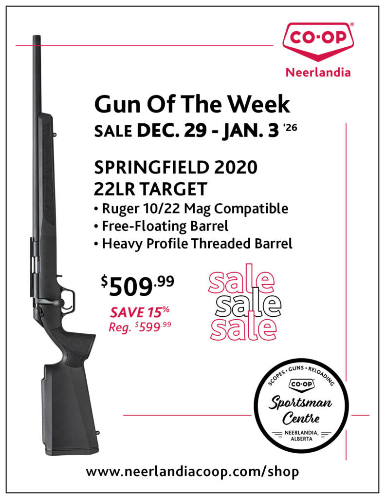 Neerlandia Co-op Sportsman Centre – feature Gun Of The Week special!From DECEMBER 29-JANUARY 3, 2026 check out: SPRINGFIELD 2020 22LR TARGETRuger 10/22 Mag CompatibleFree-Floating BarrelHeavy Profile Threaded Barrel15% OFF Regular $599.99SHIPPING AVAILABLE ACROSS CANADAConsider Membership with Neerlandia Co-op.