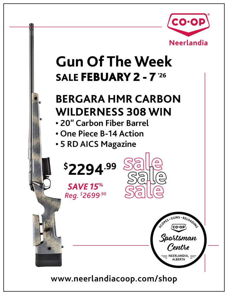 Neerlandia Co-op Sportsman Centre – feature Gun Of The Week special!From FEBUARY 2-7, 2026 check outBERGARA HMR CARBON WILDERNESS 308 WIN20″ Carbon Fiber BarrelOne Piece B-14 Action5 RD AICS Magazine15% OFF Regular $2699.99SHIPPING AVAILABLE ACROSS CANADAConsider Membership with Neerlandia Co-op.