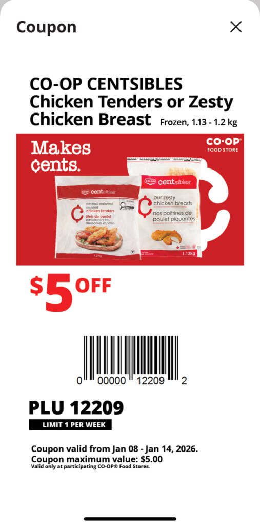 - Co-op Centsibles Chicken Tenders OR Zesty Chicken Breast, 1.13 – 1.2 kg – $5 OFF (offer Jan. 8-14, 2026 in the Food Store)