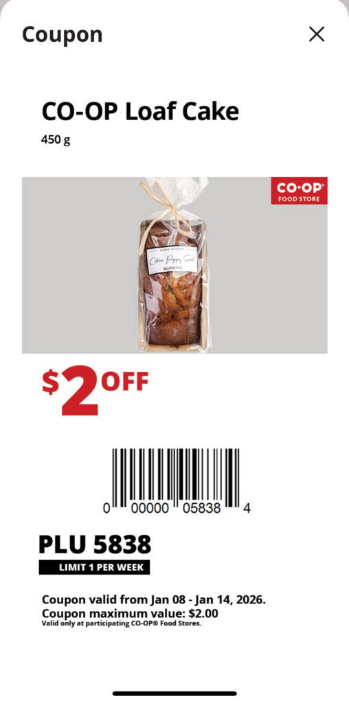 - Co-op Loaf Cake, 450g – $2 OFF (offer Jan. 8-14, 2026 in the Food Store)