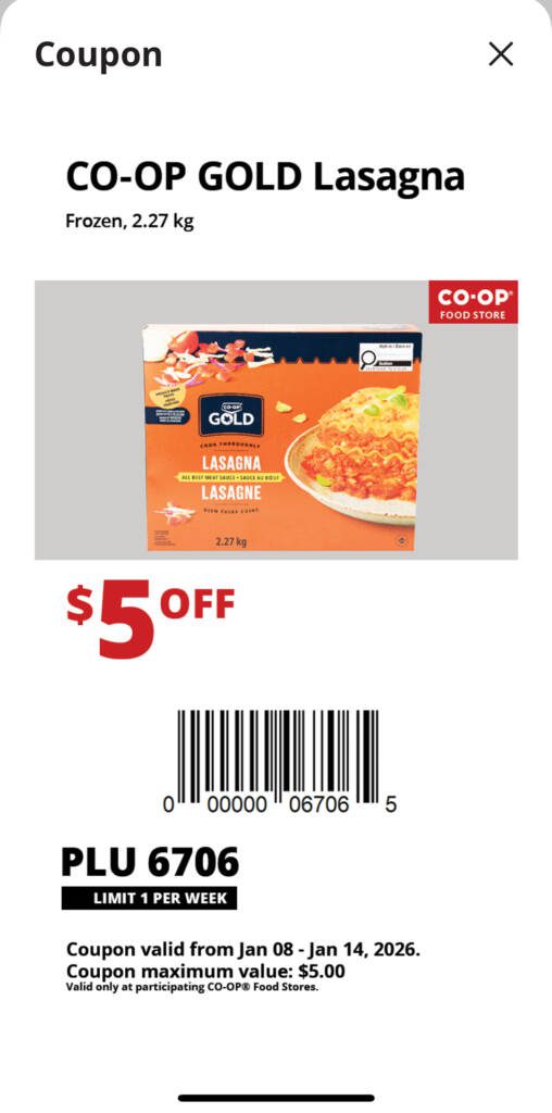- Co-op Gold Lasagna, Frozen 2.27 kg – $5 OFF (offer Jan. 8-14, 2026 in the Food Store)