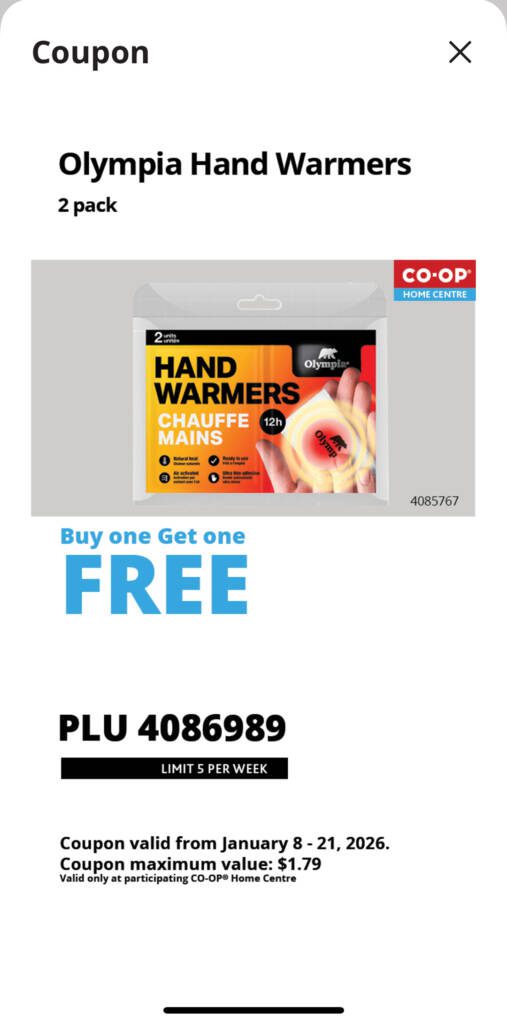 - Olympia Hand Warmers, pkg of 2 – Buy One Get One Free (offer Jan. 8 – 21, 2026 in the Hardware Store)