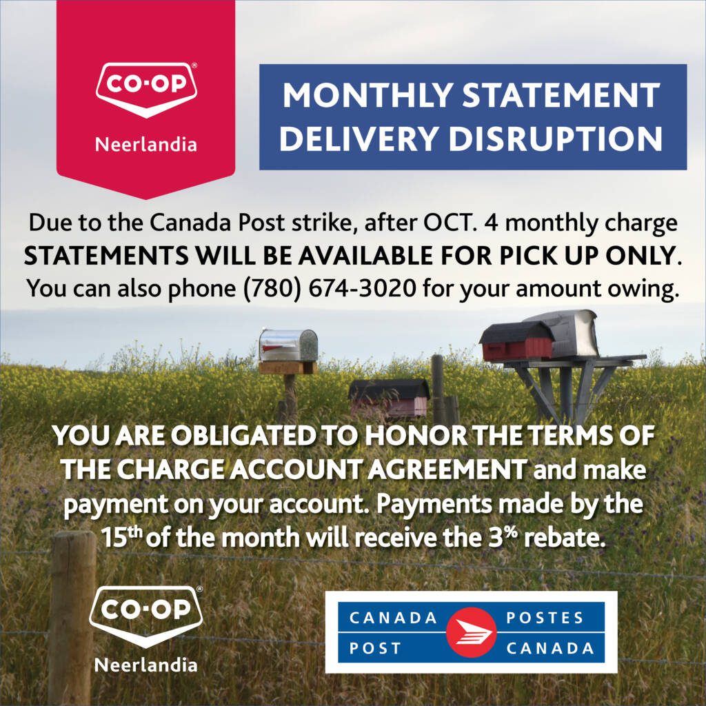 PLEASE NOTE, monthly Charge Account Statements will NOT BE MAILED OUT for the duration of the Canada Post strike. STATEMENTS CAN BE PICKED UP AT THE ADMIN DESK. You can also call (780) 674-3020 for your statement amount if you can’t make it in.