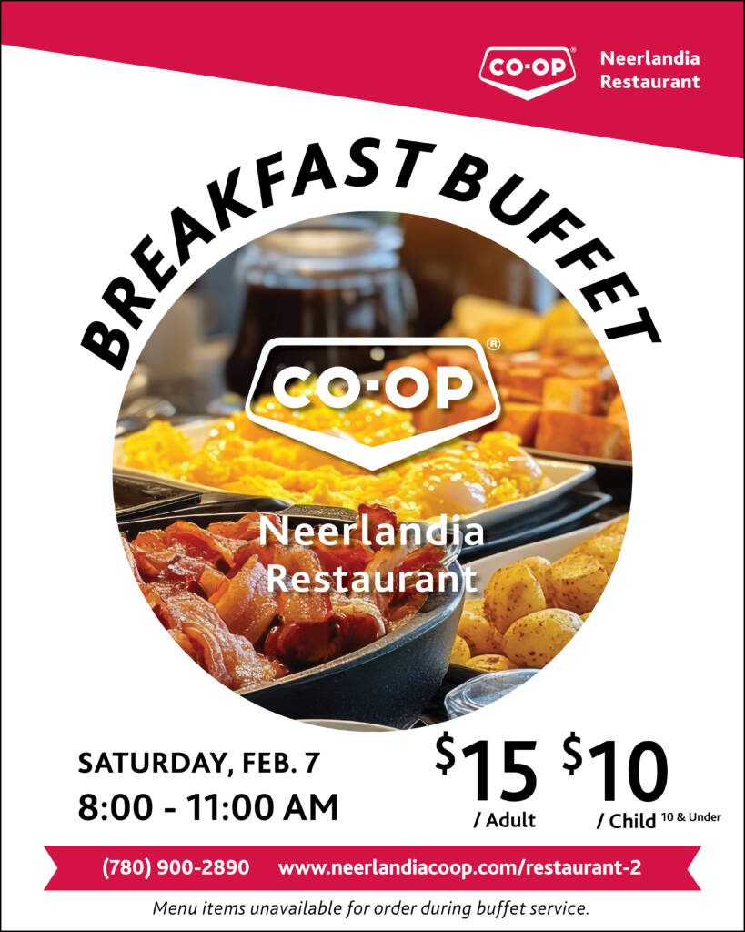 Enjoy our monthly Breakfast Buffet offer at Neerlandia Co-op’s Restaurant this Saturday, FEB. 7, 8:00 to 11:00 AM. All the breakfast classics you love on the first Saturday of each month.